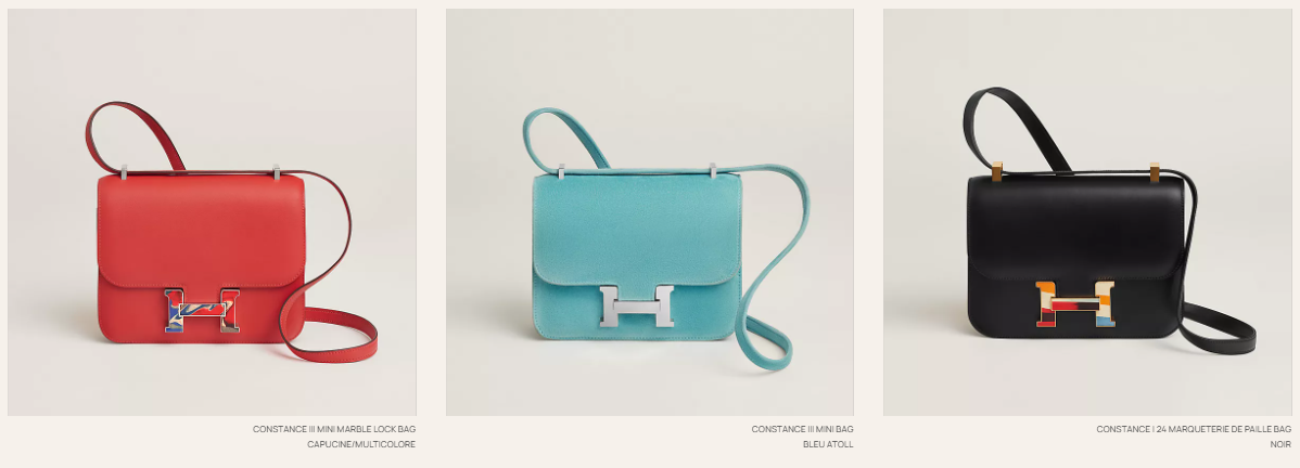 1959년 에르메스의 사내 디자이너 카트린 샤예(Catherine Chaillet)가 임신 중에 디자인한 가방으로, 그녀가 가방 출시일에 딸을 출산하면서 딸의 이름 "콘스탄스"를 따서 명명했습니다. 길쭉한 'H' 잠금장치가 특징인 이 가방은 14-18시간의 작업이 필요하며, 재클린 케네디 여사가 애용하면서 유명세를 탔습니다.