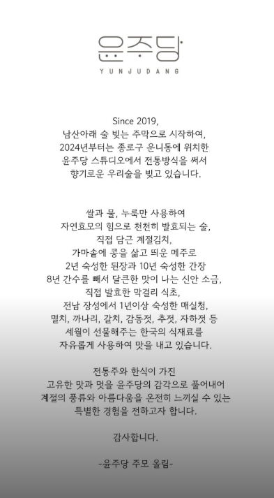 7. 2019년 해방촌에서 현대판 주막 윤주당을 열며 오너 셰프로가 되었고 2024년 종로에 '윤주당 스튜디오&브루어리'를 열어 교육 활동 중입니다.
