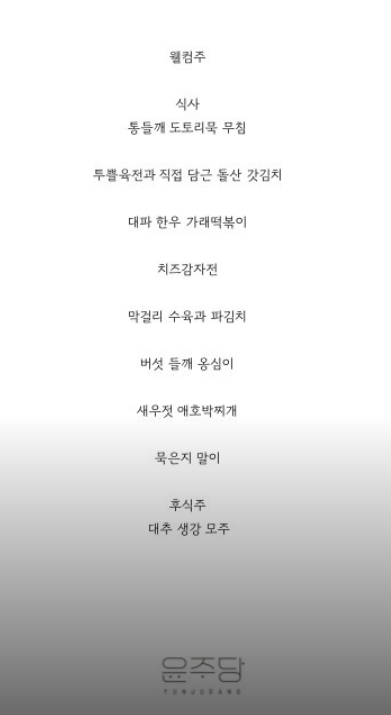 윤주당 탁주는 꼭 마셔보아야 하고요. 메인메뉴가 24000원~38000원 사이라고 합니다. 외국인들이 먹어도 좋은 메뉴들로 구성되어 있어요.