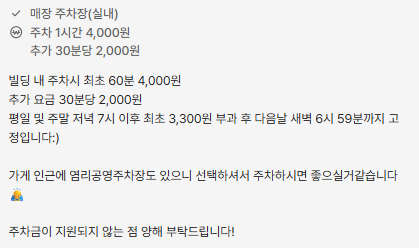 4. 주차는 한 시간에 4000원 / 추가 30분당 2000원이 추가됩니다. 가게 근처에 염리공영주차당도 있다고 해요