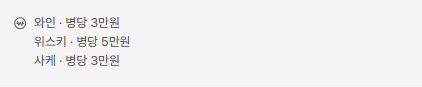 콜키지 비용은 와인은 병당 3만원/위스키는 병당 5만원/사케는 병당 3만원이에요