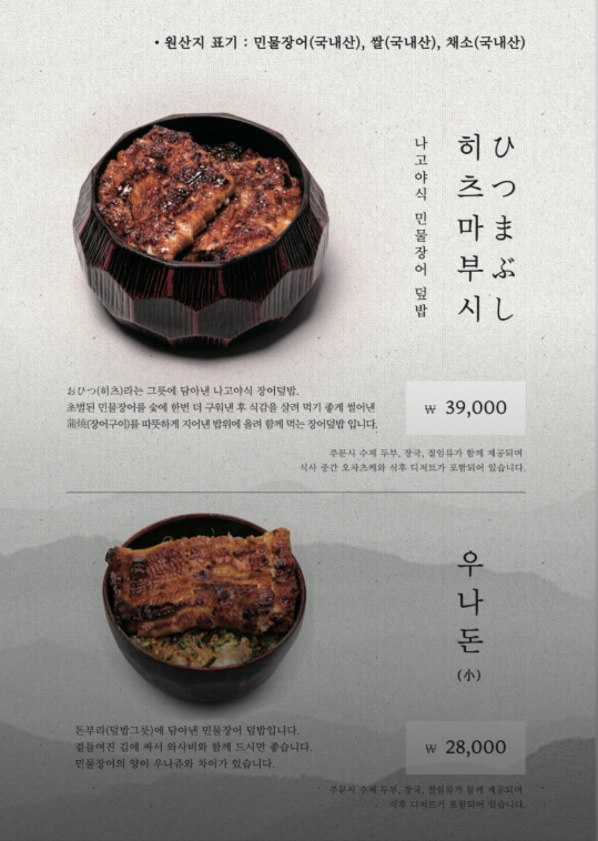 메뉴는 우나쥬, 히츠마부시, 우나돈 3가지 입니다