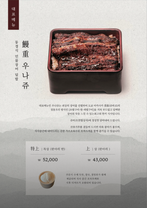 3. 일본 도쿄 아사카사에 위치한 전통장어 전문점 쥬바코(Jubako)에서 수련하며 장어 요리 기술을 전수받았다고 해요. 250년 이상의 역사를 지닌 노포로 8대째 이어지는 장인 정신이 돋보이는 곳으로 이 곳의 전통 조리법을 바탕으로 동경밥상의 히츠마부시와 우나쥬 메뉴가 완성되었다고 합니다