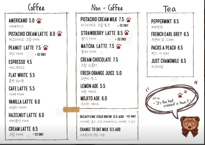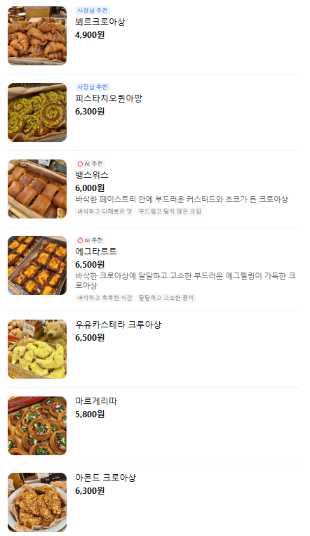 크로아상, 피스타치오 퀸아망, 뺑오쇼콜라, 초코 크룽지 등의 메뉴가 인기가 많아요
