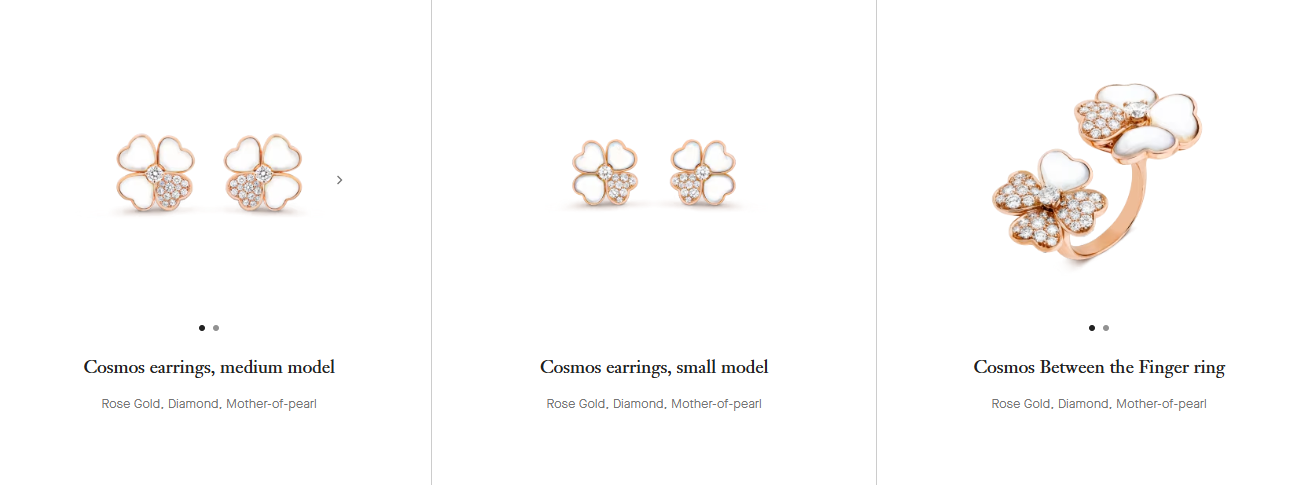 1950년대에 처음 등장한 코스모스 모티프를 기반으로 한 컬렉션으로, 네잎클로버와 꽃의 우아함을 결합한 디자인입니다. 네 개의 하트 모양 꽃잎으로 구성되어 자연스러운 움직임을 표현합니다.