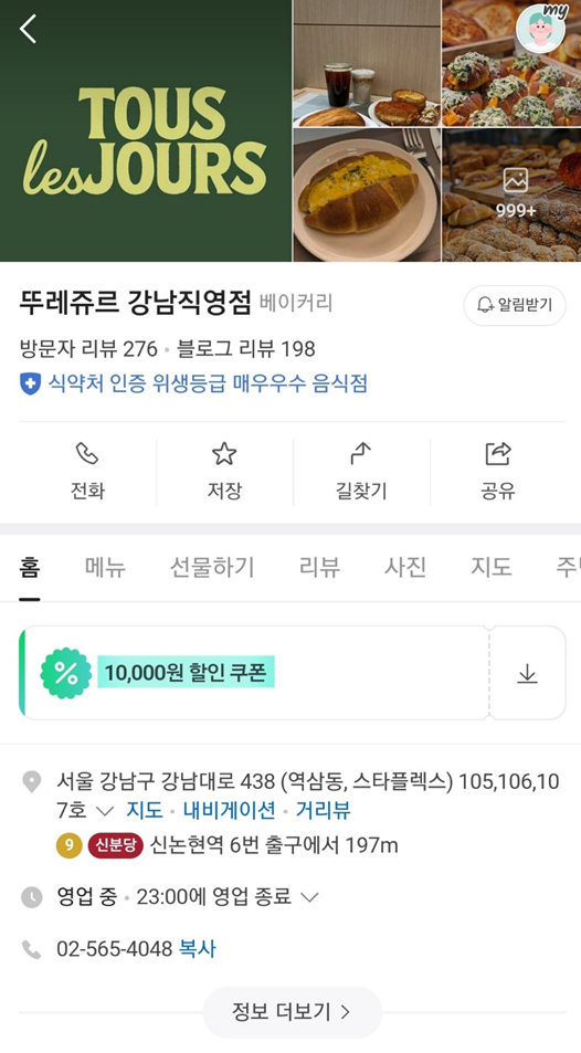 1. 네이버 앱에서 뚜레쥬르 강남직영점을 검색합니다