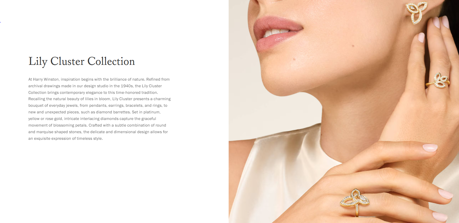 2010년에 발표된 백합의 꽃을 모티브로 한 컬렉션입니다. 1940년대 디자인 스튜디오에서 제작된 아카이브 드로잉을 바탕으로 현대적 우아함을 더한 디자인입니다. 백합이 피어나는 자연스러운 아름다움을 담아내며, 둥근 다이아몬드와 마키즈 컷 스톤의 미묘한 조합으로 꽃잎의 우아한 움직임을 표현합니다.