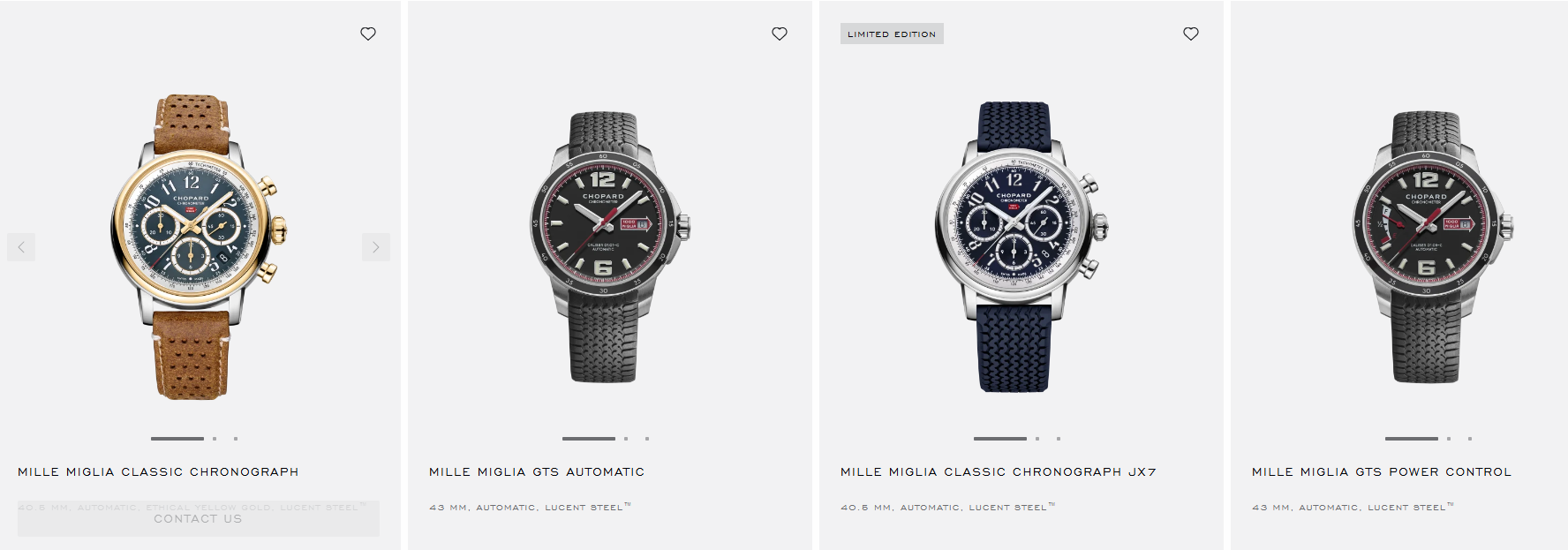 1988년 시작된 스포츠 시계 컬렉션으로, 이탈리아의 클래식 자동차 경주에서 영감을 받았습니다. 칼-프리드리히 셰펠레의 클래식카 열정에서 출발했으며, 레트로하면서도 현대적인 디자인이 특징입니다. 타이어 패턴을 형상화한 러버 스트랩이 시그니처입니다. 매년 밀레 밀리아 경주 참가자들을 위한 한정판이 제작됩니다.