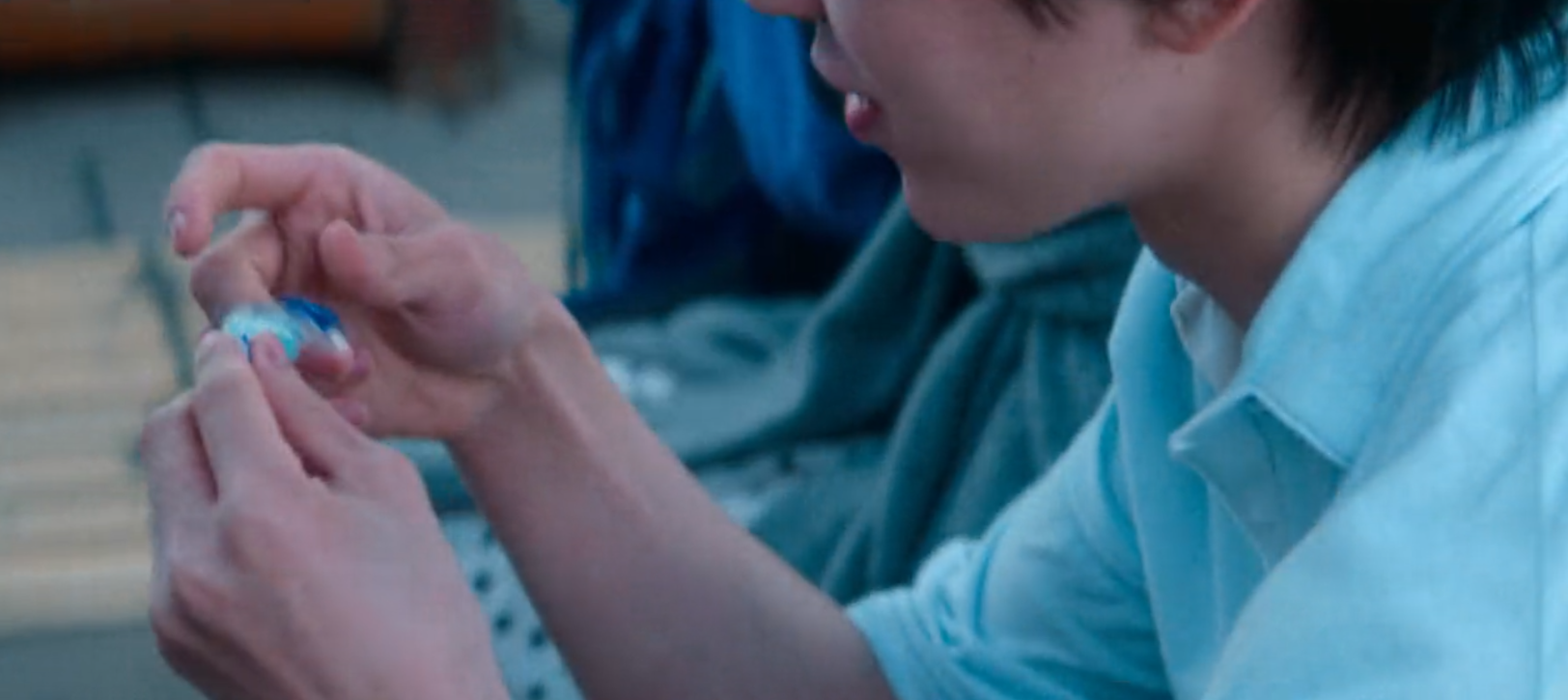 야에가 내미는 사탕을 보고 옛날 생각에 잠기는 하루미치