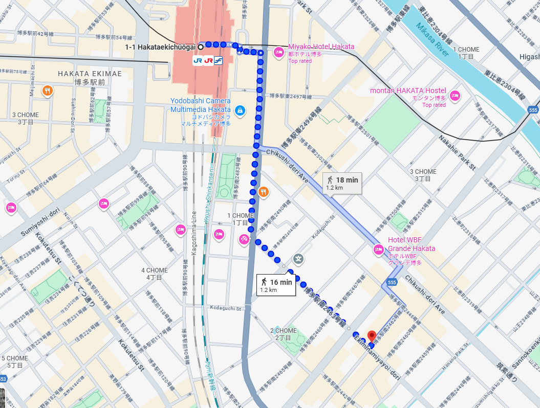 Hakata 역에서 도보로 16분 정도 걸리네요